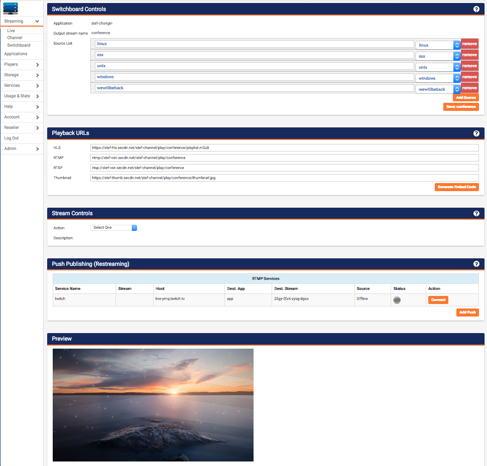 With the ScaleEngine switchboard system you can run virtual conferences remotely. Set up a Zoom call and send it into a live stream, or have the presenter stream directly using camera capture. This way you can have your presenters connect in without needing to setup an encoder. You can then setup a switchboard, with a channel showing the conference schedule or a standby splash screen for when the talk is not started yet.